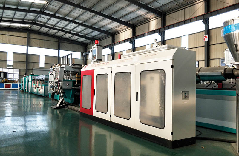 PC陽光板設備由擠出機、快速換網裝置、模具、定型臺、一次牽引機及切邊裝置、熱烘箱、覆膜裝置、二次牽引機、切割裝置、輸送機、料架等組成。中空板擠出線特備配備的定型機和退火爐,其特點如下:真空定型臺的耐磨性、除塵性、定型性,使其更容易操作;高速螺桿,高旋轉速度匹配減速泵和穩(wěn)定壓力的低能耗消耗;擠出量高于其他品牌的25%,原因是其定型板的特殊設計;定型板的冷卻系統(tǒng)和真空系統(tǒng)的獨特設計保證高速度的擠出定型;特殊的退火爐設計,相比其他品牌的擠出線更容易控制,板材的平整度;牽引輥的柔軟度按客戶的要求設計;中空板的空氣容量和低壓要進行調整并容易操作;特殊模塊是由模具專門為PC陽光板設計的。產品的雙壁厚度范圍要在2mm到10mm之間。雙壁之間的棱要成直角和對角線形狀; 抗UV共擠層可以單面可以雙面,根據結構要求外表層要進行噴砂處理或光滑處理。高比例可回收薄片可以和原材料混合一起。